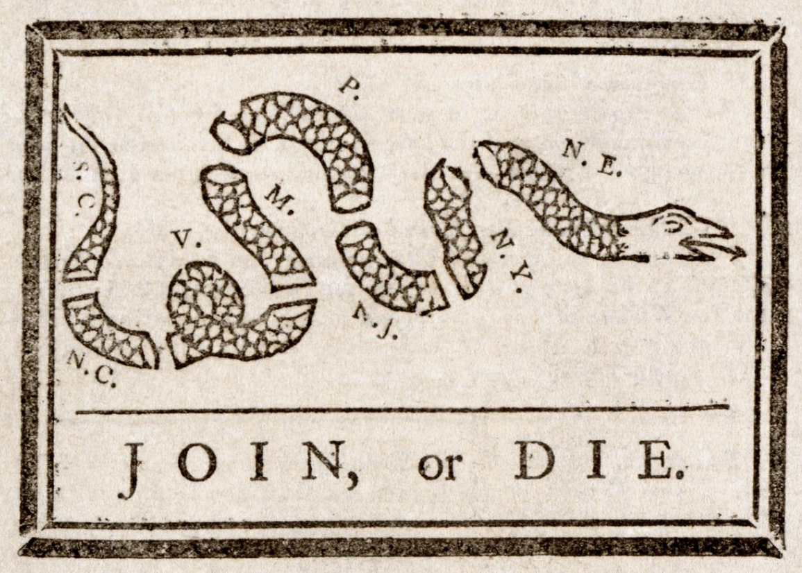 In 1754, during the French and Indian War, Franklin published his famous woodcut of a snake cut into eight sections. It represented the colonies, with New England joined together as the head and South Carolina as the tail, following their order along the coast. Under the snake was the message "Join, or Die". This was the first political cartoon published in an American newspaper.
