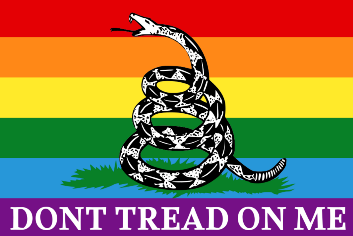 Street Patrol, a 1990s queer self defense group affiliated with Queer Nation/San Francisco, used as its logo a coiled snake over a triangle holding a ribbon with the motto "Don't Tread on Me".[30][31] Some libertarian circles use a version of the flag with the snake and motto placed over a rainbow flag.[32] Following the 2016 Orlando nightclub shooting, posters containing a rainbow Gadsden flag inscribed with "#ShootBack" were placed around West Hollywood, upsetting members of the community and city government who opposed its apparent violent message.[33]