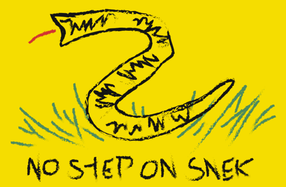 Parodies of the Gadsden flag are common, altering the image or motto to mock the symbol. One common parody design replaces the "Don't Tread on Me" motto with "No Step on Snek", sometimes paired with a crudely drawn snake.[34]
