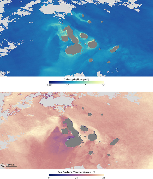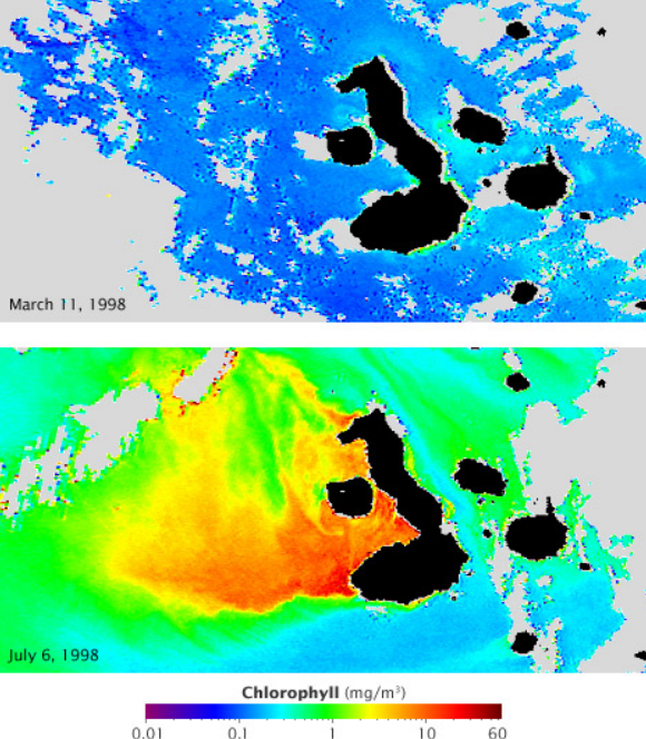 Although the islands are located on the equator, the Humboldt Current brings cold water to them, causing frequent drizzles during most of the year. The weather is periodically influenced by the El Niño events, which occur about every 3 to 7 years and are characterized by warm sea surface temperatures, a rise in sea level, greater wave action, and a depletion of nutrients in the water.[16]