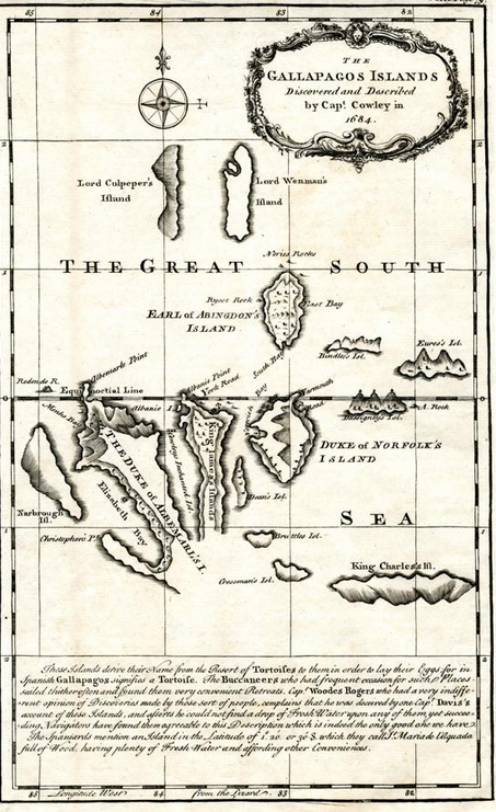 The Galápagos Islands first appeared on the maps of Gerardus Mercator and Abraham Ortelius, in about 1570.[21] The islands were named "Insulae de los Galopegos" (Islands of the Tortoises) in reference to the giant tortoises found there.[22]