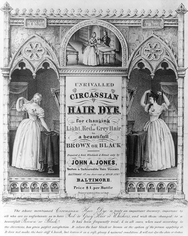 "Circassian Eye-Water" was marketed as "a sovereign remedy for all diseases of the eyes",[29] and in the 1840s "Circassian hair dye" was marketed to create a rich dark lustrous effect.[30]