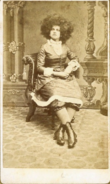 The portrayal of a white woman as a rescued slave at the time of the American Civil War played on the racial connotations of slavery at the time. It has been argued that the distinctive hairstyle affiliates the side-show Circassian with African identity, and thus,
