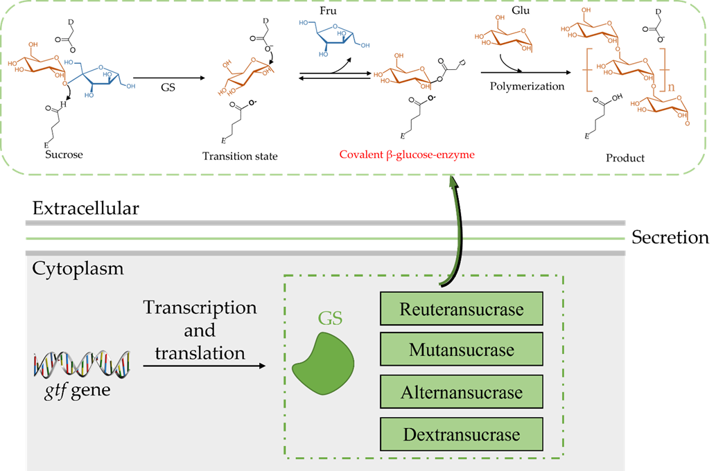 Glucansucrase (GS) belongs to the GH70 family, which not only can synthesize exopolysaccharides (EPSs) with different physicochemical properties through glucosyl transglycosylation (by hydrolyzing sucrose) but can also produce oligosaccharides.