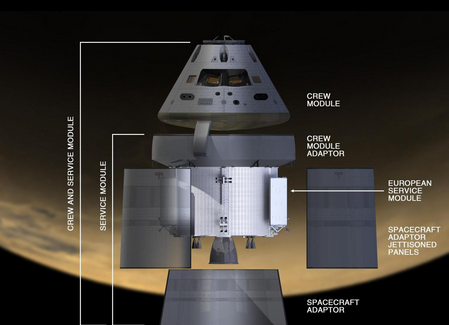 Lockheed Martin is building the two adapters, connecting the service module to the crew module and to the upper stage of the Space Launch System, and also the three fairing panels that are jettisoned after protecting the service module during launch and ascent.[13]