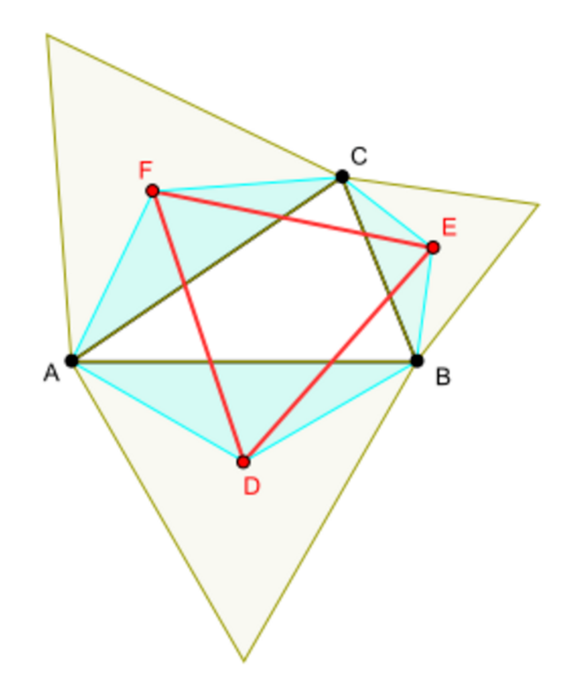 A1 is formed by the apices of the isosceles triangles with apex angle 2π/3 erected over the sides of the triangle A0. The vertices of A1 are the centers of equilateral triangles erected over the sides of triangle A0. Thus the specialisation of the PDN theorem to a triangle can be formulated as follows: