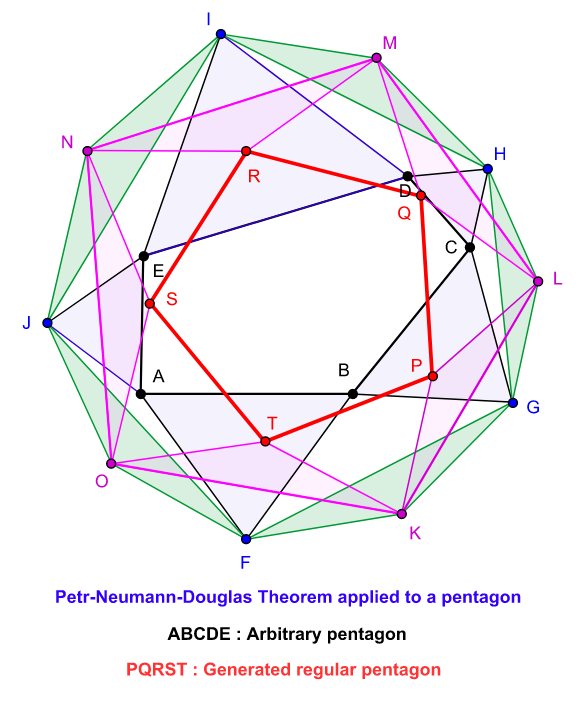 In geometry, the Petr–Douglas–Neumann theorem (or the PDN-theorem) is a result concerning arbitrary planar polygons. The theorem asserts that a certain procedure when applied to an arbitrary polygon always yields a regular polygon having the same number of sides as the initial polygon. The theorem was first published by Karel Petr (1868–1950) of Prague in 1908. The theorem was independently rediscovered by Jesse Douglas (1897–1965) in 1940 and also by B H Neumann (1909–2002) in 1941. The naming of the theorem as Petr–Douglas–Neumann theorem, or as the PDN-theorem for short, is due to Stephen B Gray. This theorem has also been called Douglas's theorem, the Douglas–Neumann theorem, the Napoleon–Douglas–Neumann theorem and Petr's theorem. The PDN-theorem is a generalisation of the Napoleon's theorem which is concerned about arbitrary triangles and of the van Aubel's theorem which is related to arbitrary quadrilaterals.