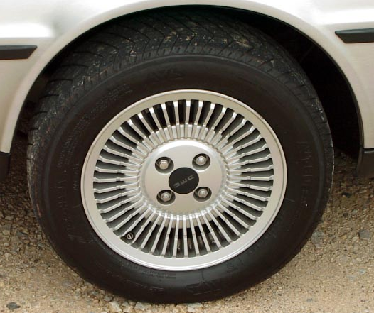 Although the styling of the DeLorean's wheels remained unchanged, the wheels of early-model 1981 vehicles were painted grey. These wheels sported matching grey centre caps with an embossed DMC logo. Early into the 1981 production run, these were changed to a polished silver look, with a contrasting black center cap. The embossed logo on the center caps was painted silver to add contrast.