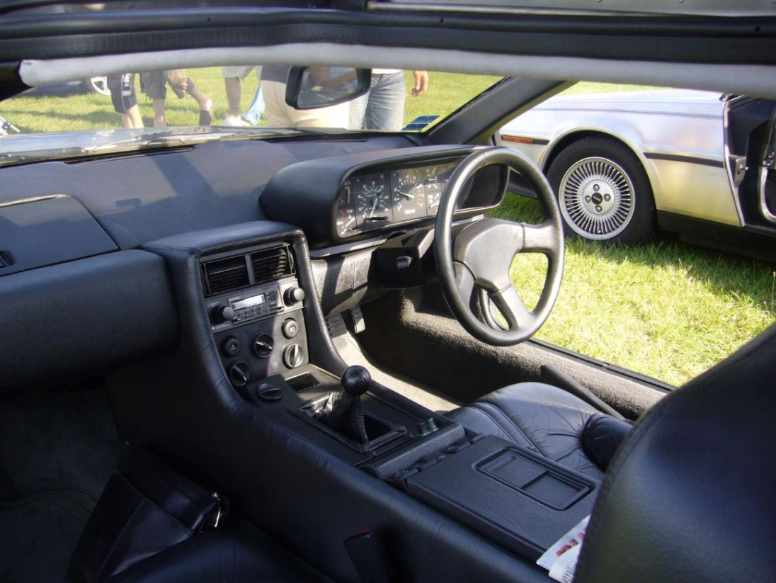 The DMC-12 was only available with two factory options; a no-cost manual transmission or automatic transmission and the choice of a grey or black interior. Several dealer options were available, including a car cover; floor mats; black textured accent stripes; grey scotch-cal accent stripes; a luggage rack and a ski-rack adapter. The standard feature list included stainless-steel body panels; gull-wing doors with cryogenically treated torsion bars; leather seats; air conditioning; an AM/FM cassette stereo system; power windows, locks and mirrors; a tilt and telescopic steering wheel; tinted glass; body side moldings; intermittent/constant windshield wipers; and an electric rear-window defogger.[29][30]