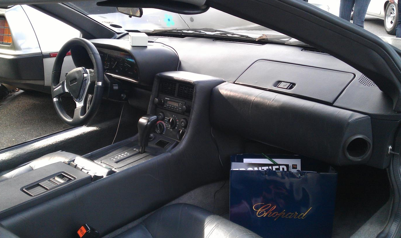 Another distinctive feature of the DMC-12 is its gull-wing doors. The common problem of supporting the weight of gull-wing doors was solved by other manufacturers with lightweight doors in the Mercedes-Benz 300SL and a hydraulic pump in the Bricklin SV-1, although these designs had structural or convenience disadvantages. The DMC-12 features heavy doors supported by cryogenically preset torsion bars and gas-charged struts.[13] These torsion bars were developed by Grumman Aerospace (and built by Unbrako in the UK, a division of SPS Technologies of Jenkintown, PA) to withstand the stresses of supporting the doors.[14] A popular misconception of the DMC-12's gull-wing doors is that they require far more side clearance to open relative to ordinary side-hinge doors, such as when parked in a parking lot. In fact, the opposite is true: the DMC-12 requires far less clearance than side-hinge doors, and this can be physically demonstrated. This misconception of side clearance may stem from a misunderstood location of the hinge point of the doors by persons unfamiliar with DMC-12s. These doors, when opening, only require 11 inches (28 cm) clearance outside the line of the car, making opening and closing the doors in crowded spaces relatively easy. Much like the doors fitted to the Lamborghini Countach, the DMC-12 doors featured small cutout windows, because full-sized windows would not be fully retractable within the short door panels. Additionally, the doors featured red and amber "safety" lights around the perimeter. These lights illuminated when the door was open and could be seen from the front, rear or side of the vehicle at night or in low-light situations.[15][16]