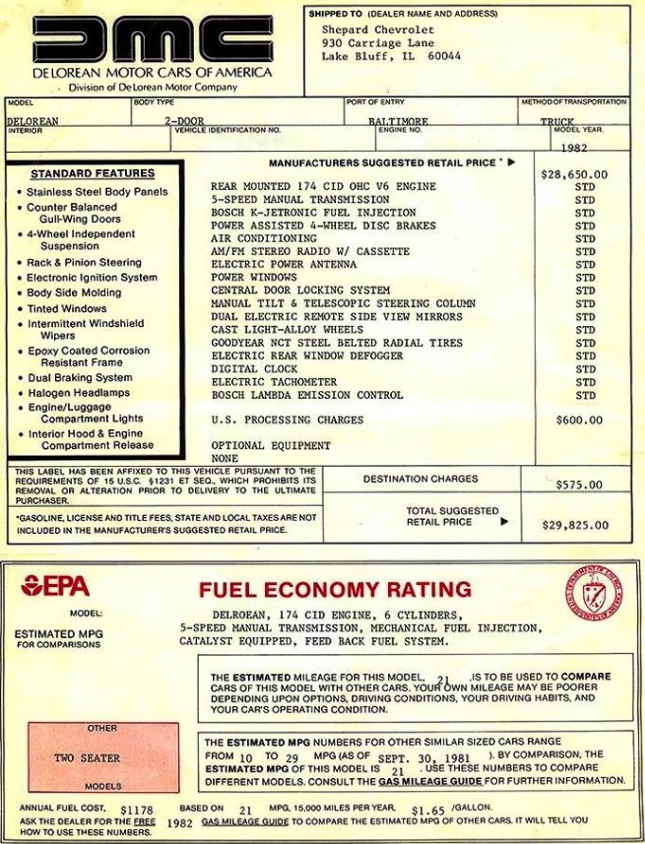 The car was named the DMC-12 because of its intended price of US$12,000. Upon release in 1981, a DMC-12 had a suggested retail price of US$25,000 ($650 more when equipped with an automatic transmission); this is equivalent to approximately US$70,306 in 2019.[25]. MSRP would increase in 1982 to $29,825[26] and again in 1983 to $34,000[27]. At the outset, there were extensive waiting lists of people willing to pay up to $10,000 above the list price; however, after the collapse of the DeLorean Motor Company, unsold cars could be purchased for less than the retail price.[28]