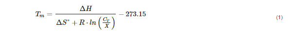 where R is the gas constant 1.9872 × 10−3 kcal K−1 mol−1; the number in the second term, −273.15, is a conversion factor from K to °C; CT is the total molar concentration (M) of the strands; and X is considered four for non-self-complementary duplexes.