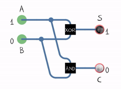 The half adder adds two single binary digits A and B. It has two outputs, sum (S) and carry (C). The carry signal represents an overflow into the next digit of a multi-digit addition. The value of the sum is 2C + S. The simplest half-adder design, pictured on the right, incorporates an XOR gate for S and an AND gate for C. The Boolean logic for the sum (in this case S) will be A′B + AB′ whereas for the carry (C) will be AB. With the addition of an OR gate to combine their carry outputs, two half adders can be combined to make a full adder.[1] The half adder adds two input bits and generates a carry and sum, which are the two outputs of a half adder. The input variables of a half adder are called the augend and addend bits. The output variables are the sum and carry. The truth table for the half adder is: