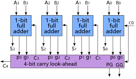 By combining multiple carry-lookahead adders, even larger adders can be created. This can be used at multiple levels to make even larger adders. For example, the following adder is a 64-bit adder that uses four 16-bit CLAs with two levels of lookahead carry units.