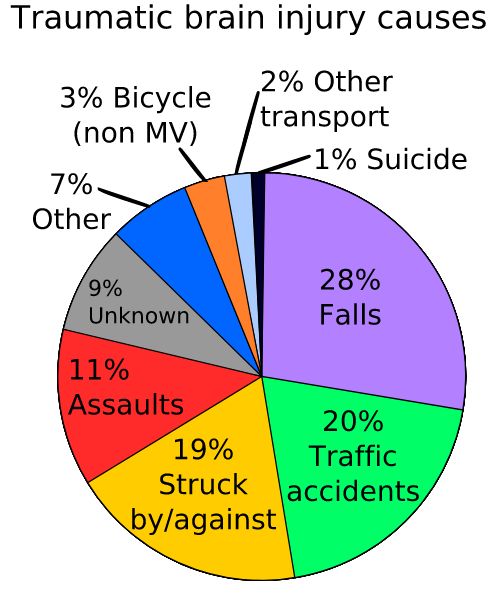 Traumatic brain injury happens when the head suffers from a sharp blow, or suddenly accelerates or decelerates. In these cases, the brain gets churned around, and can be damaged by the bony bumps and knobs inside the skull, or by the twisting and tearing of fibres in the brain.[7] If the traumatic brain injury is severe enough, it can lead to an initial coma, which is then followed by a time of post-traumatic amnesia. Post traumatic amnesia typically resolves itself gradually, however it will leave a mild, but permanent deficit in the patient's memory.[7]