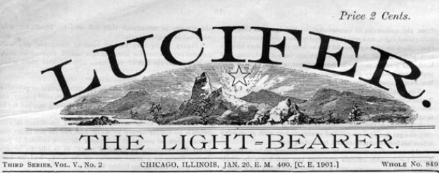 Lucifer the Lightbearer was an individualist anarchist journal published in the United States by Moses Harman in the late 19th and early 20th centuries. It has been reported that "the title was selected, stated Harman, because it expressed the paper's mission. Lucifer, the name given to the morning star by the people of the ancient world, served as the symbol of the publication and represented the ushering in of a new day. He declared that freethinkers had sought to redeem and glorify the name Lucifer while theologians cursed him as the prince of the fallen angels. Harman suggested that Lucifer would take on the role of an educator. 'The god of the Bible doomed mankind to perpetual ignorance,' wrote Harman, 'and [people] would never have known Good from Evil if Lucifer had not told them how to become as wise as the gods themselves.'"[31]