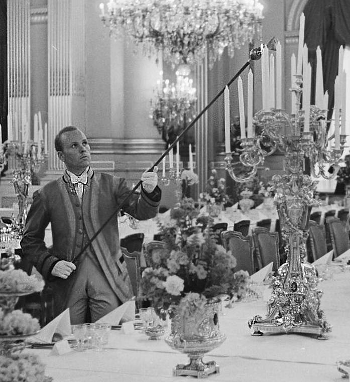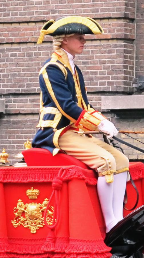 At the Dutch court the full state livery is blue (nassaublauw). The breeches are yellow, and cuffs are red.