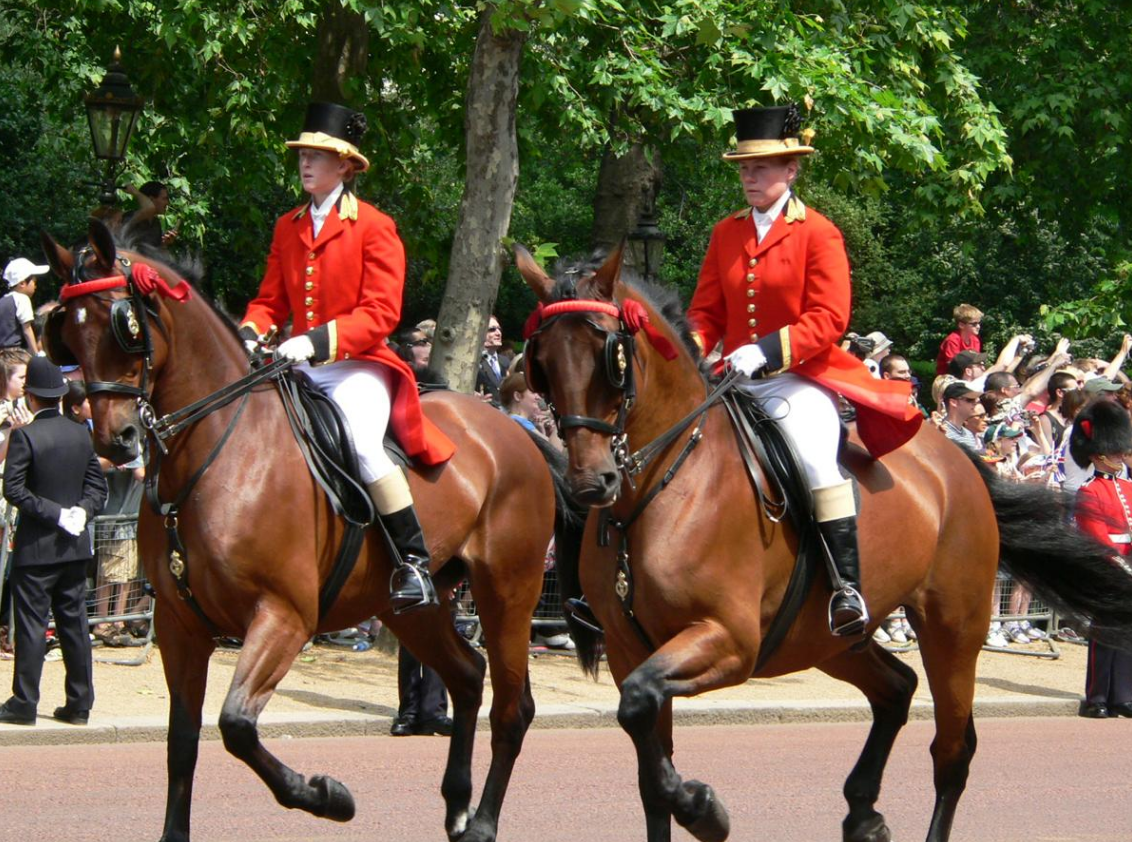Outriders from the Royal Mews, wearing scarlet livery. https://handwiki.org/wiki/index.php?curid=1843957