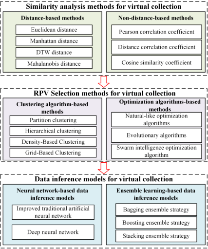 The previous section introduces the specific implementation steps of virtual collection and its purpose, and pinpoints the urgent need to provide solutions to the challenges faced by the above steps. Therefore, this section provides theoretical support for the development of virtual collection technology by summarizing the methods applicable to DPVS similarity analysis, RPS selection, and DPVS data inference in various fields. Various methods for DPVS virtual collection are summarized in Figure 8.