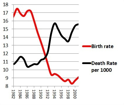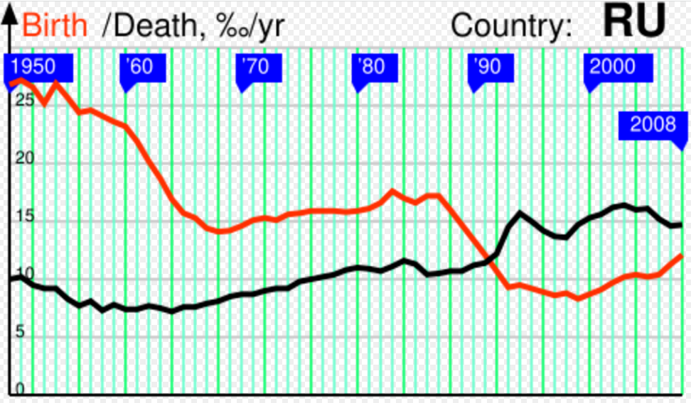 In collaboration with Daria Khaltourina he has made a significant contribution to the study of the factors of the current Russian demographic crisis. They have demonstrated that post-Soviet Russia experiences one of the world's highest prevalence of alcohol-related problems, which contributes to high mortality rates in this region. Reduction in alcohol-related problems in Russia can have strong effects on mortality decline. They have analysed the plausibility of application of general principles of alcohol policy translated in the Russian Federation. Korotayev and Khaltourina have shown that alcohol policy approaches could be implemented in the same ways as they have been in other countries, and contributed to the development of alcohol control measures in this country. In addition, according to Korotayev, there should be special attention to decreasing distilled spirits consumption, illegal alcohol production, nonbeverage alcohol consumption, and enforcement of current governmental regulations.[28] In late 2014 they correctly predicted the forthcoming return of Russia to negative natural population growth.[29]