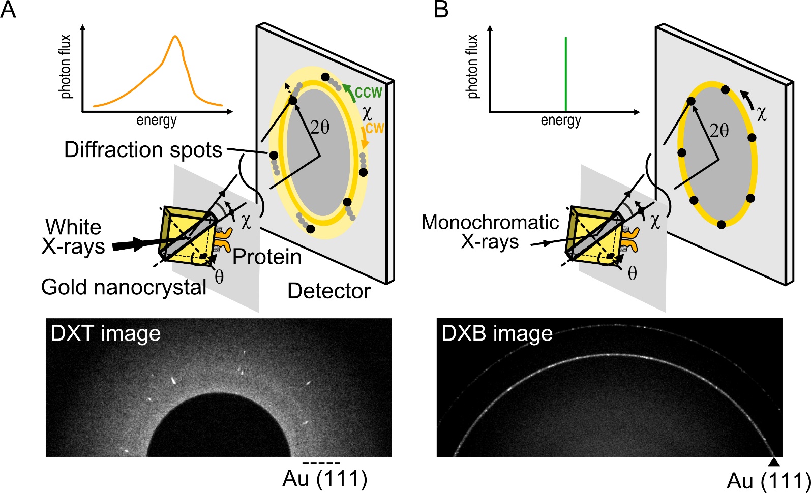 Figure 2. Diffracted X-ray tracking (DXT) and diffracted X-ray blinking (DXB) methods. (A) In DXT, the specific domain of a target protein is labeled with gold nanocrystals, with a diameter of 40 nm to 80 nm. The diffraction spots represent the tilting (θ) and twisting (χ) motions. DXT using white X-rays can analyze the trajectories of Laue spots appearing over a wide detector area. (B) DXB uses monochromatic X-rays, and the diffraction spots appear on the diffraction rings. The intramolecular motions are analyzed from the intensity changes of the Au (111) diffraction rings.