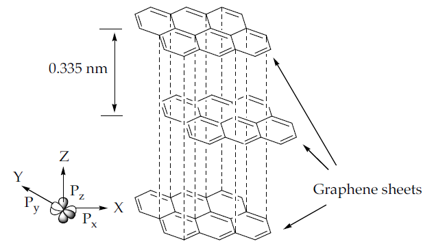 Graphene is an allotrope of carbon that consists of unique hybridisation properties [24, 25]. Generally, carbon has a ground state orbital configuration of 1s2 2s2 2p2 in which the energy gaps between the 2s and 2p orbitals are narrow, promoting one 2s electron to jump to a vacant higher energy 2p orbital. The electron excitation allows carbon to hybridise into sp, sp2, and sp3 configurations, leading to a variety of molecular structures. Every orbital configuration has a specific molecular geometry. For instance, the sp orbital configuration forms circular regions or nodes to represent the s orbital and the dumbbell structure of the px, py, and pz orbital, which forms chain structures. Meanwhile, the sp2 and sp3 orbitals form planar and tetrahedral structures, respectively. All graphene derivatives exhibit the sp2 and sp structure due to the fact of their hexagonal ring structure with layers of the crystalline honeycomb lattice. The 2pz orbital of the carbon atoms can imbricate successfully if they are parallel or out-of-plane π bonds, contributing to the lowest energy of the graphene sheet when it is completely flat. Furthermore, the π orbital in graphene located specifically at the double-bonded C=C region is scattered throughout the graphene sheet, making it highly mobile and thermally and electrically conductive. The distribution of π orbital is known as the delocalisation of electrons. The hexagonal lattice with π electrons tends to undergo electron delocalisation to stabilise the force due to the spreading energy over a larger area rather than confining it to a small area. The graphene layers in graphite are usually separated by a minimal gap of 0.335 nm from each other [26], as shown in Figure 2. A weak van der Waals forces holds the adjacent graphene sheets together, allowing them to move easily and become more lubricative towards one another.