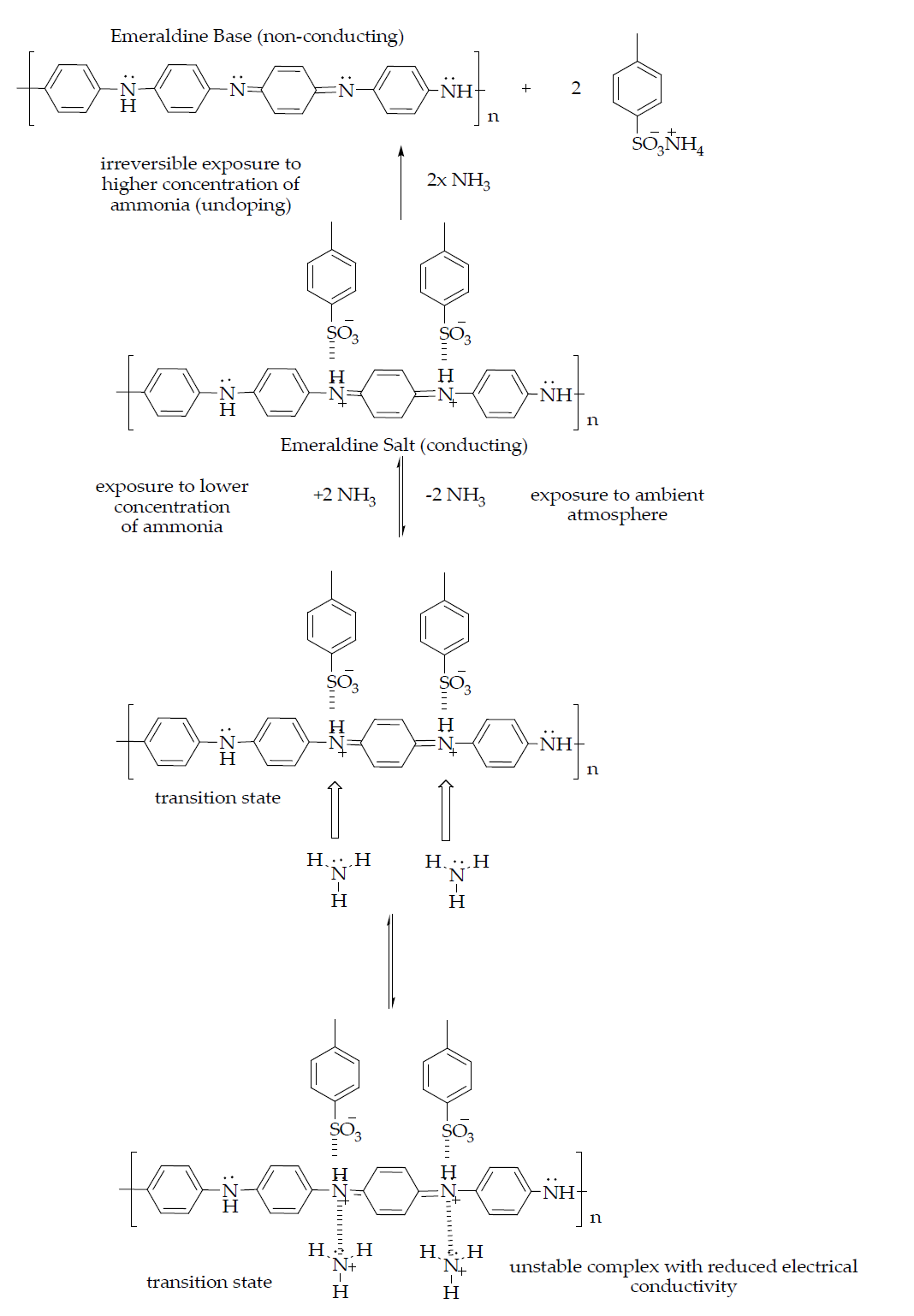 On the other hand, the undoping or dedoping process which is also known as the compensation or electrical neutralisation of a doped polymer is the process in which p-type doped polymer reacts with several reducing agents and regains its insulating state. The undoping agents diffuse into the polymer matrix and neutralise the charges of the system through a charge-transfer reaction. The undoping process involves chemical reactions between the undoping agents and dopant or carbonium ion, which leads to neutralisation by charge transfer. The undoping process has a high possibility of being affected by thermal treatments. The common undopant agents used for the undoping process include NH3, water, and hydrazine. The chemical reaction of the process is shown in Equations (14)– (16):