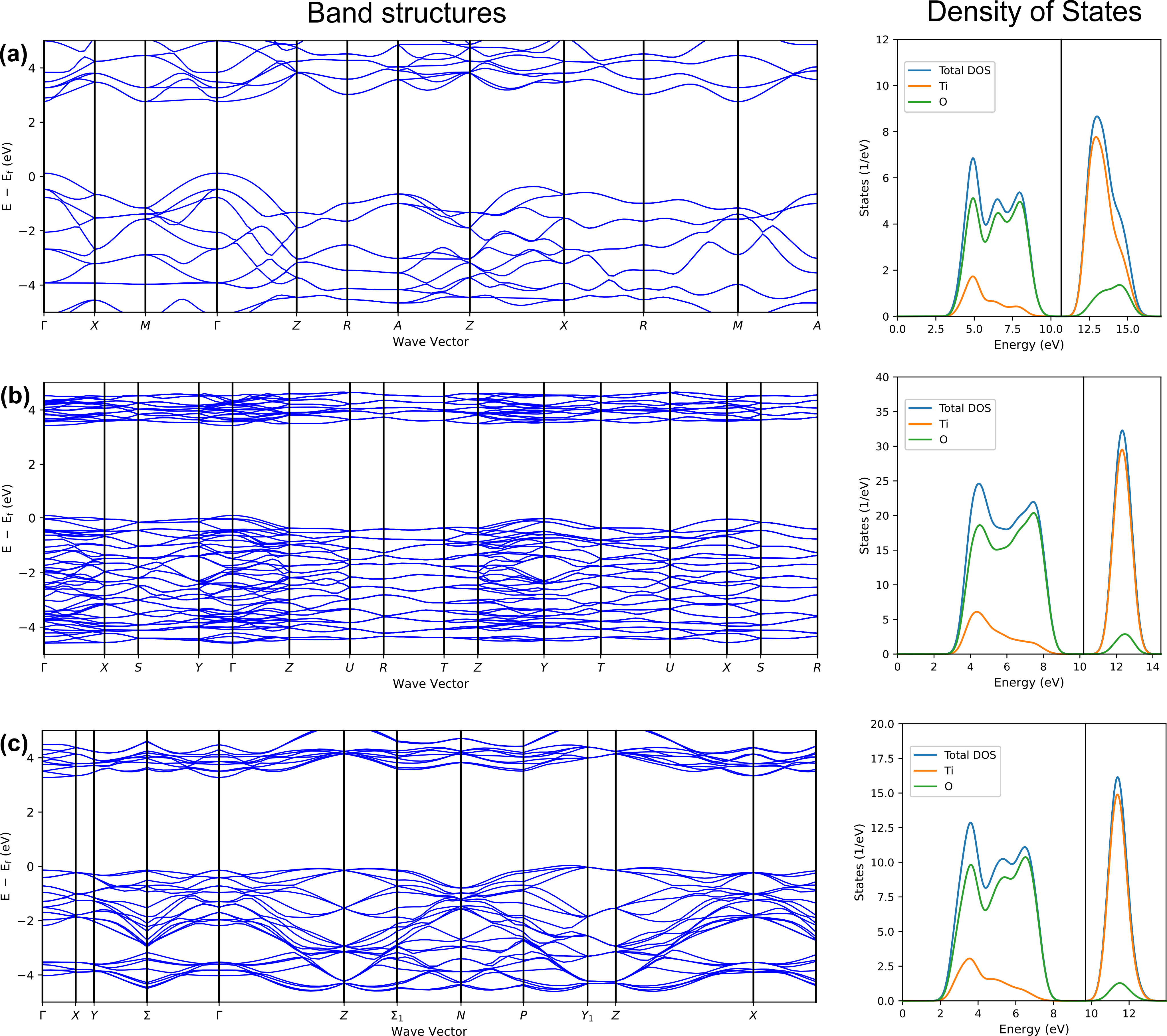 Figure 2. Band structures (left panel) and projected density of states (right panel) for the (a) rutile), (b) brookite, and (c) anatase polymorphs of TiO2, as obtained by DFT+U calculations (PBE functional, GBRV pseudopotentials, , ) in Quantum Espresso program as implemented in Schrödinger Materials Science Suite 2022-4.