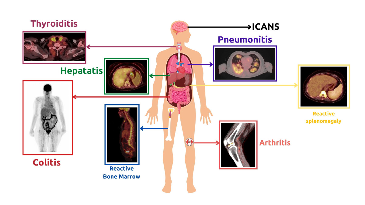 Figure 8. Clinical examples of Immunotherapy-Related Adverse Effects observed during FDG PET/CT imaging in lymphoma patients receiving immunotherapy.