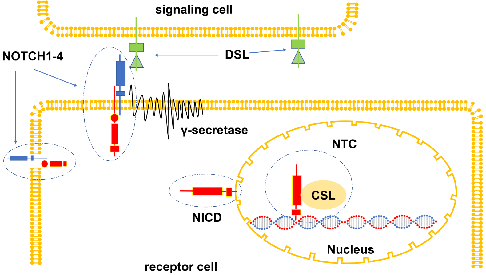 The NOTCH signaling pathway is composed of NOTCH ligand, NOTCH receptor, related enzymes, transcription factor CSL, regulatory factor, and NOTCH signaling downstream molecules[17] (Figure 1). NOTCH ligands, namely Delta/Serrate/Lag2 (DSL) family, belong to one-way transmembrane proteins. Mammals have five DSL ligands: Dll1, Dll4, and Dll3 are members of the delta-like ligand family; Jag1 and Jag2 are members of the serrate ligand family[18]. The NOTCH receptors, a series of transmembrane glycoproteins, are composed of extracellular regions, transmembrane regions, and cytoplasmic regions[19].The NOTCH receptors (NOTCH1-4), encoded by different genes, differ in structures and can be degraded by a variety of proteases[20]. The cleaved NOTCH intracellular domain (NICD) is released into the cytoplasm and then transported to the nucleus to form the NOTCH transcription complex (NTC), which is composed of NICD, DNA binding factor, and transcriptional coactivators[20]. After combining with NOTCH regulatory element (NRE), NTC recruits transcription coregulatory factors and starts the transcription of the specific target genes (such as Hes1, Hes5, etc.)[20]. The signaling cascade of the NOTCH pathway often begins with the interaction between the NOTCH receptor and the DSL ligand[21]. DSL ligands activate specific NOTCH receptors and induce their cleavage. Then NOTCH intracellular domain (NICD) is released and transported to the nucleus, thus forming NOTCH transcription complex (NTC) with transcription factor CSL, which acts as a transcription coactivator to start the transcription of NOTCH target genes[21].