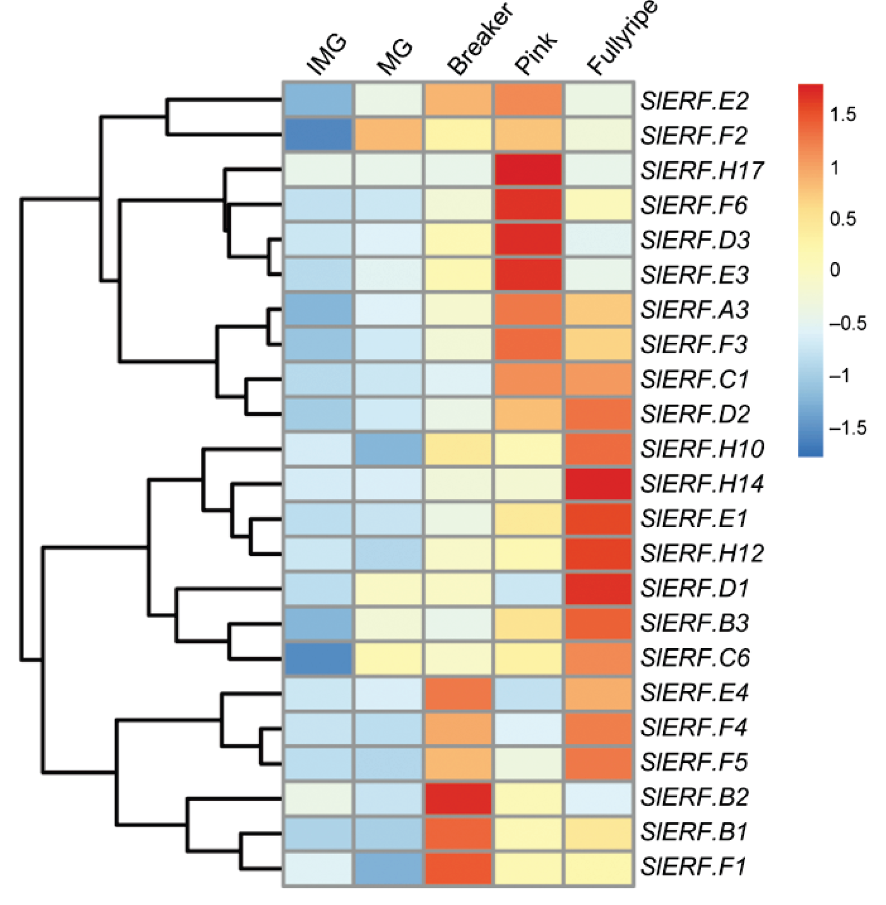 Figure 2. Gene expression pattern of ERFs in tomato fruit during ripening. Data for wildtype (Ailsa Craig, AC) tomato fruit, downloaded from TomExpress (http://tomexpress.toulouse.inra.fr/, [46]) on 15 March 2022. IMG, immature green fruit, 17 days post-anthesis (dpa); MG, mature green fruit, 39 dpa; Breaker, first sign of color change, 42 dpa; Pink, full color change, 45 dpa; Fully ripe, fruit that have reached peak ripening stage. Genes are clustered by expression patterns using pheatmap package in R 4.2.1 software. The values are displayed in color ranging from blue (low) to red (high), with genes with values below 0.5 excluded from the heatmap.