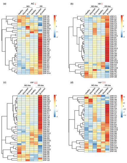 Figure 3. Gene expression pattern of ERFs in tomato (a) wildtype (Ailsa Craig, AC) and ripening mutant (b) rin, (c) cnr and (d) nor in healthy fruit and fruit infected with B. cinerea or uninfected (wounded). Wildtype tomato fruits were picked at mature green (MG) and red ripe (RR) stages; the ripening mutant fruits including Cnr, nor, rin were picked at MG-like and RR-like stages, all of which included healthy (healthy, neither wounded nor infected), wounded (wounded but did not infected) and B. cinerea (wounded plus infected with B. cinerea) fruits. All tomato fruit were sampled at 1 day post-inoculation (dpi) and fruit pericarp and epidermal tissue, excluding seeds, of the blossom end halves of healthy, wounded, and infected fruit were collected. Raw transcriptome data (accession number: GSE148217) were downloaded from the NCBI database and transformed to FPKM using hisat2 tools. The FPKM values were normalized by row and displayed with color ranging from blue (low) to red (high). Genes with FPKM values in all the tissues below 10 were considered as low-level transcripts and are not displayed in the heatmap. A single