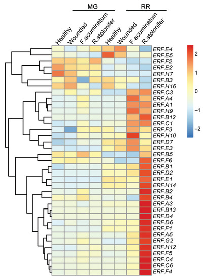 Comprehensive transcriptomic profiling of tomato ERF genes in WT fruits of healthy, uninoculated wounded F. acuminatum (wounded with F. acuminatum inoculation), R. stolonifer (wounded with R. stolonifer inoculation) at two different ripening stages (MG and RR) was carried out using information from the NCBI database. A heatmap representing their expression pattern shows 37 ERF genes excluding those with a low level of transcripts (selected by FPKM > 10) (Figure 4).