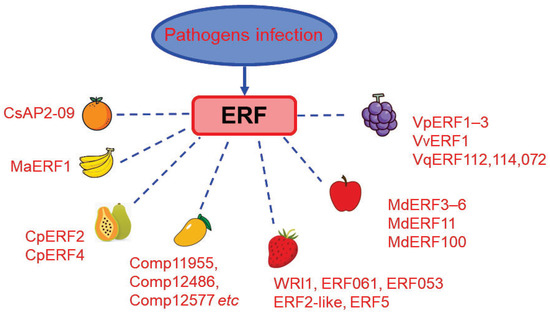 In this article, we review and summarize the current status of studies on ERFs that regulate fleshy fruit ripening and fruit resistance to pathogens, as part of an investigation into novel approaches for altering transcriptional regulation to improve fruit quality and pathogen resistance.