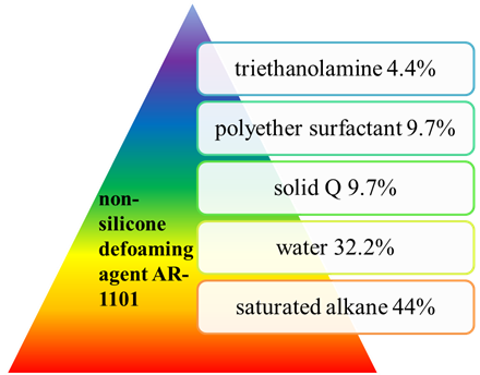 Hong Zhou et al. [40] developed a new non-silicone defoaming agent AR-1101 that has an effect similar to that of an NF defoaming agent. The formula was: polyether surfactant 9.7%, saturated alkane 44%, triethanolamine 4.4%, solid Q 9.7% and water 32.2%, as shown in Figure 10. The above materials were heated and stirred, and when the temperature reached about 90 °C, the oil/water phase emulsion was obtained by holding for several hours. AR-1101 has the appearance of a creamy white thick liquid, non-ionic, with a solid content of more than 40%, pH 6–8, and is non-corrosive. AR-1101, a new multi-component non-silicone defoaming agent, has good stability and a long-lasting defoaming effect. At 50 °C, its defoaming height up to 25 mm, and it is widely used. Although it was popularized in 1987, the critical defoaming temperature needs to be further increased. The full-type measuring cylinder method (AR-1101 and NF comparison test) was used.