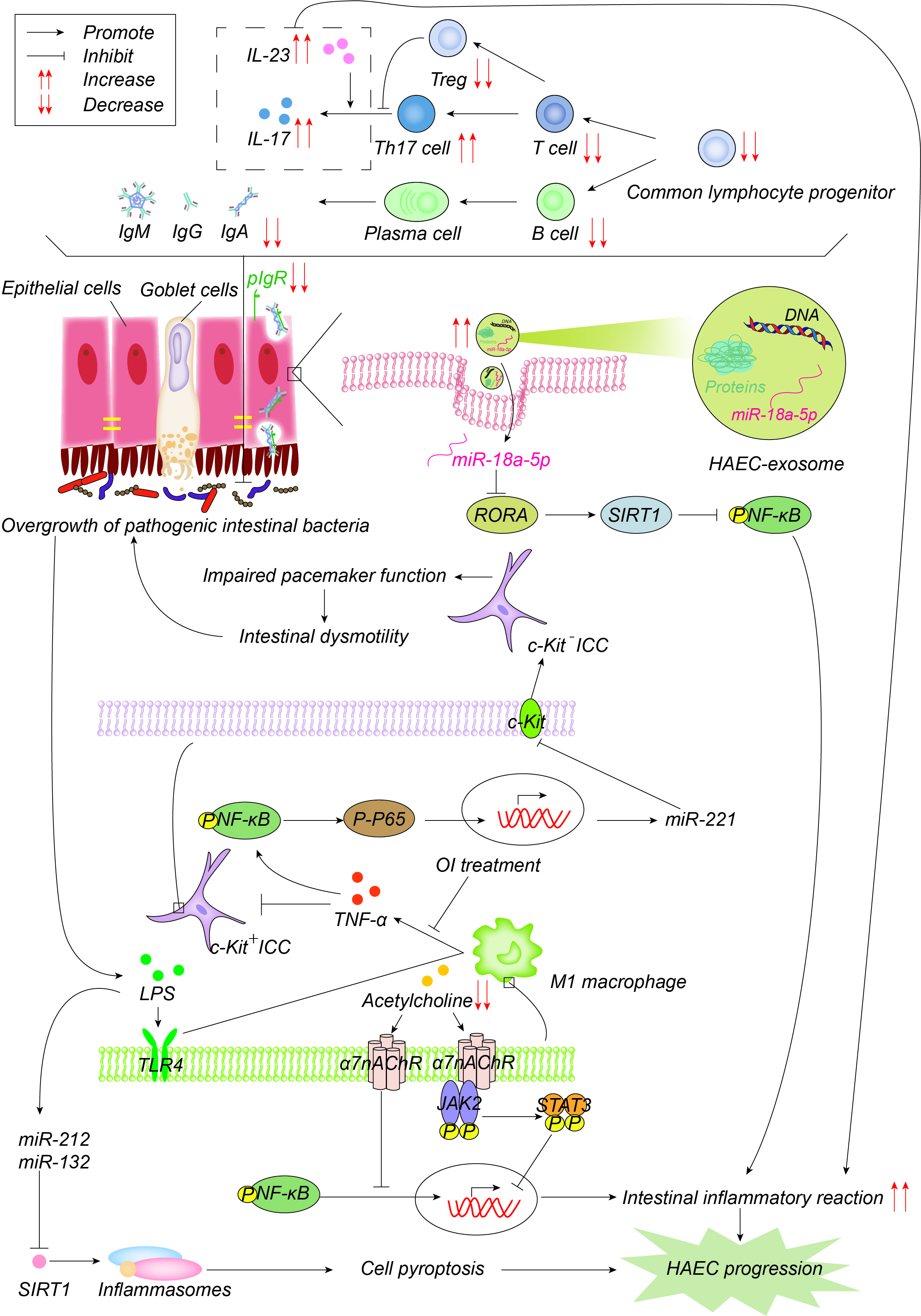 Figure 4. Pathogenesis advances in immunity. The number of common lymphocyte progenitor populations and, therefore, T cells and B cells decrease significantly, resulting in reduced immunoglobulin, which is actively transported to the mucosal surface by polymerized immunoglobulin receptors (pIgR) in the form of dimers to maintain the intestinal microenvironment balance and normal function. pIgR is also reduced, which together leads to intestinal microenvironment disturbances and bacterial overgrowth. Increased Th17 cells produce more IL-17 and promote the intestinal inflammatory response. On one hand, LPS produced by bacteria activates M1 macrophages through the TLR4 pathway, and M1 macrophages produce TNF-α, which inhibits c-Kit expression in ICC through the NF-κB/miR-221 pathway, leading to intestinal motility disorders, which further leads to the accumulation and overgrowth of intestinal bacteria. 4-octyl itaconate (OI) reduces the production of proinflammatory factors and promotes ICC phenotypic recovery by inhibiting macrophage activation. LPS, on the other hand, induces the up-regulation of miR-132/-212, activates inflammasome NOD-, LRR-, and pyrin domain-containing protein 3 (NLRP3) by inhibiting the expression of sirtuin 1 (Sirt1), promotes cell pyroptosis, and then promotes the occurrence and development of HAEC. Acetylcholine acts on α7 nicotinic acetylcholine receptor (α7nAChR) on the surface of macrophages, inhibits the activation of macrophages, activates the anti-inflammatory pathway of JAK2-STAT3 and suppresses the inflammatory pathway of NF-κB. Acetylcholine in HAEC is reduced, and the above anti-inflammatory effects are weakened. Exosome miR-18a-5p down-regulates RAR-related orphan receptor A (RORA), activates the SIRT1/NF-κB signaling pathway, induces excessive inflammatory response, and thus promotes the development of HAEC.