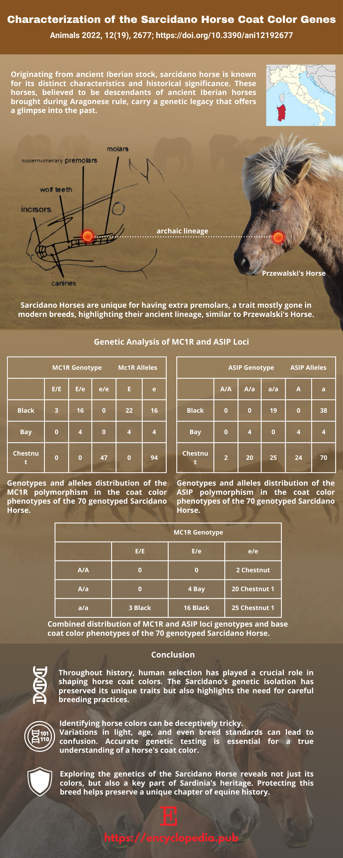 A recent study aimed to deepen the understanding of the Sarcidano Horse, specifically its coat color genetics. The focus was on two genes, MC1R and ASIP, which are responsible for determining the basic coat colors: bay, black, and chestnut.